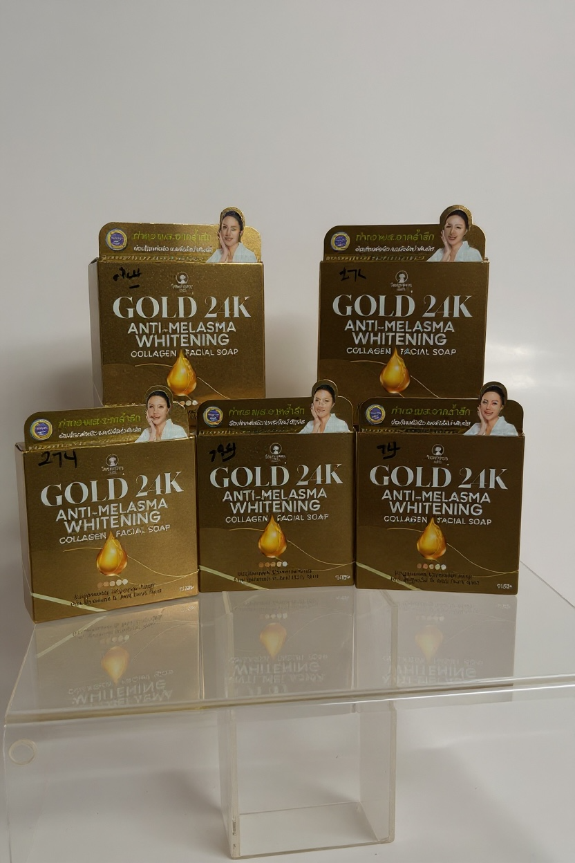 The Gold 24K Whitening Anti-Melasma Facial Collagen Soap is a premium facial soap formulated to combat melasma, reduce acne, freckles, and dark spots. Infused with 24K pure gold and a blend of powerful ingredients like alpha arbutin, kojic acid filtrate, snail secretion filtrate, and ginseng root extract, this soap helps brighten and rejuvenate dull skin. It penetrates deep into the skin to address pigmentation issues and promote a radiant, even-toned complexion. The luxurious 24K gold provides additional skin benefits, helping to enhance skin clarity and luminosity.
