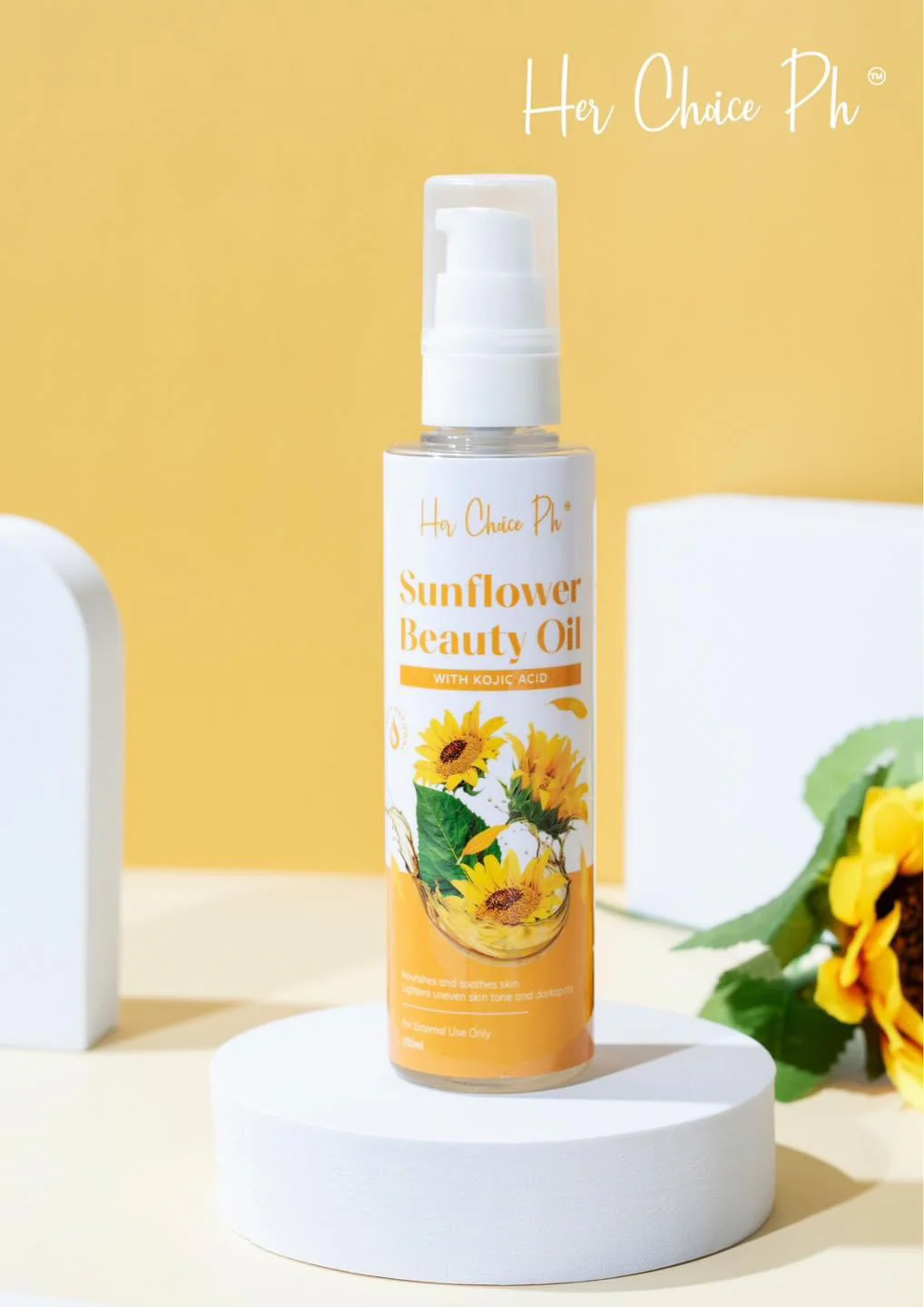 Her Choice Is Sunflower oil is infused withKojic acid is a revolutionary product formulated with care and innovation. The unique Blend if skin nourishing if sunflower skin oil withg the powerful brightenbing skin effect of kojic acid.